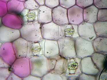 Se tomó una hoja de Zebrina y se le realizó el respectivo corte con una cuchilla. Se hizo el montaje en el portaobjetos, se ubicó debidamente el cubreobjetos y se llevó al microscopio observando en 4x, 10x y 40x. | Se observa en objetivo 40x las células vegetales, los estomas conformados por las células oclusivas de coloración verde por los cloroplastos, el ostiolo, las células anexas y las células fundamentales. En la parte más externa se observan las células de la epidermis que rodean las más coloridas que le dan el color característico a la Zebrina (moradas). |