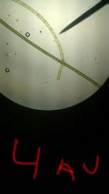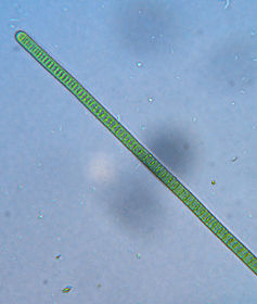 Mediante una pipeta se tomó una pequeña muestra de agua del estanque y se ubicó en el portaobjetos con su respectivo cubreobjetos. Se observaron: | Fig 6. -Cianobacterias Antiguamente llamadas algas verde azuladas, son un filo del dominio Bacteria que comprende las bacterias capaces de realizar fotosíntesis oxigénica. Son los únicos procariontes que llevan a cabo ese tipo de fotosíntesis, por ello también se les llamó oxifotobacterias. Las cianobacterias más comunes son unicelulares cocoides, a veces agregadas en una cápsula mucilaginosa, o formando filamentos simples. Los filamentos pueden aparecer agregados en haces, envueltos por mucílago, o de una manera que aparenta ramificación. Existen además cianobacterias que forman filamentos con ramificación verdadera. |