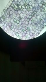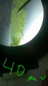 Se observaron las células vegetales y su forma en celdas y alargadas. En 4x se logró diferenciar la pared celular y el citoplasma; en 10x se alcanzan a ver unos puntos muy diminutos que serían el núcleo pero aun así no se divisan bien. En 40x aunque se observan más grandes las células no se pudo ver el núcleo en su mayor proporción. | Microalgas Fig 5.Muestra de microalgas tomada del estanque en objetivo 10x. |