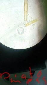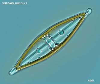 Fig 9. Diatomeas - Diatomeas Algas unicelulares. Son organismos fotosintetizadores que forman parte del plancton (fitoplancton). Las diatomeas observadas en el laboratorio presentan cloroplastos amarillo-marrones, carecen de flagelo. Muchas diatomeas no poseen movimiento, aunque algunas otras poseen movimiento flagelado. Las diatomeas están contenidas dentro de una única pared celular de silicato (frústula) compuesta de dos valvas separadas. Las valvas de las diatomeas se superponen una a otra como las dos mitades de una placa de Petri (esto es, como una caja y su tapadara). | Fig 10. Diatomeae o Bacillariophyceae en objetivo 40x. |