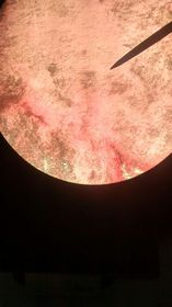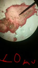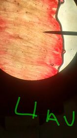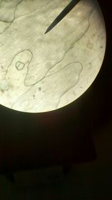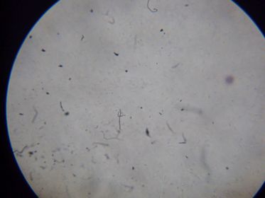 Semen Fig 14. Muestra de semen con esperma objetivo 40x. | Luego de haber obtenido el líquido seminal con ayuda de un portaobjeto se toma una pequeña muestra y se comienza a enfocar en el microscopio a 4X, 10X, 40X. Se procede a observar a traves el lente del microscopio objetivo de aumento 40x el líquido seminal. En objetivo 100x se logra ver un pequeño movimiento de los microorganismos, la forma y sus movimientos. |