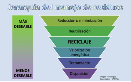 | Reciclaje de los plásticos: La generación de residuos y su manejo adecuado son dos de los grandes retos que enfrentan las sociedades actuales para garantizar su viabilidad y sustentabilidad. | La mejor opción es la reducción, es decir, el modificar los procesos, actividades y patrones de consumo, de forma que se disminuya la generación de residuos. A esta opción le siguen la reutilización, el reciclaje, la valorización energética, el tratamiento y la disposición en rellenos sanitarios |