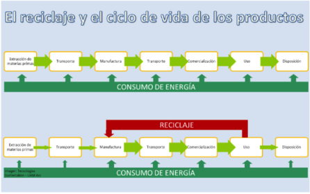 | Aunque el reciclaje se considera generalmente como una forma de manejo de residuos, en realidad constituye una actividad que permite modificar todo el ciclo de vida de los productos, pues al reciclar un residuo se disminuye la necesidad de extraer y procesar nuevas materias primas. | |