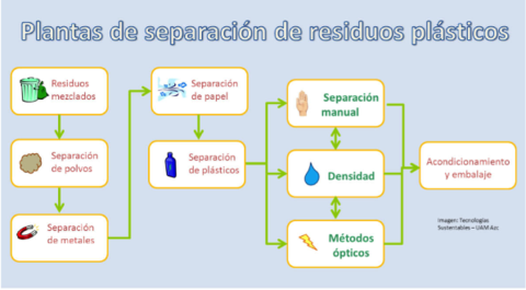 | Métodos de sepraración: La forma más fácil y eficiente de separación de los plásticos es la separación en la fuente, es decir, la que realiza el usuario directamente al desechar sus residuos. | Una vez que los residuos plásticos han sido separados en la fuente, existen dos formas de recolectarlos. La primera es la recolección selectiva, es decir, un proceso en el que en distintos momentos se colectan diferentes materiales. La segunda implica que el usuario lleve sus residuos a un punto de recolección |