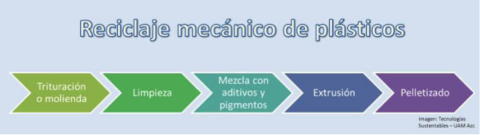 | Reciclaje secundario o mecánico: En esta categoría se agrupan todos los procesos físicos de reciclaje, es decir, aquellos en los que no se modifica la estructura química o la composición de los plásticos. Pueden realizarse a partir de residuos post-industriales o post-consumo, que mediante tratamientos térmicos son transformados nuevamente en pellets, perfiles o madera plástica | |