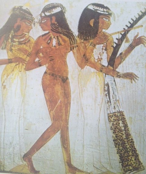 El antiguo Egipto era una civilización eminentemente agrícola, así pues, los instrumentos que primero hacen su aparición, tenían un objetivo práctico antes que artístico. Consistían en dos palos de madera que entrechocaban, con el propósito de ahuyentar las plagas de langosta y también como ritual para favorecer la fertilidad de las tierras de cultivo. Hacia el año 3.500 a.C. encontramos la primera representación de un instrumento musical del antiguo Egipto, se trata del seba, un instrumento parecido a una flauta que tocaban dos danzarinas. |