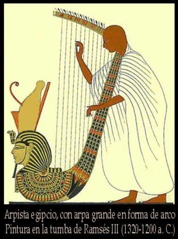 En el Imperio Antiguo Egipcio | Aparece un instrumento musical de percusión que tuvo una gran importancia, se trata del sistro (sakhm), consistía en una lámina de metal en forma de herradura. Entre los dos brazos de la herradura se insertaban unas varillas metálicas que eran las encargadas de producir el sonido al ser pulsadas. El arpa o baïnit aparece hacia el año 2.600 a.C. Éste será un instrumento realmente representativo de la música en el antiguo Egipto. |