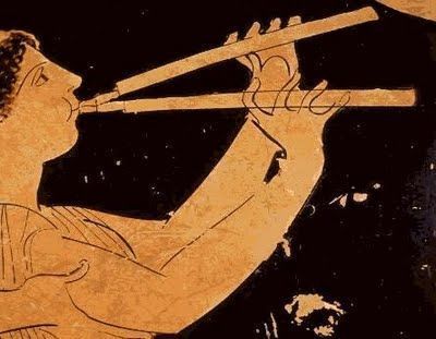 El aulos | Los instrumentos musicales más populares eran la lira y la cítara, pero existía además el aulos. El aulos era un instrumento de viento formado por dos caños dobles en forma de ángulo. Este instrumento se dedicaba a la adoración de Dionisio. |