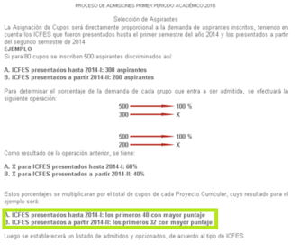 | OPCION 2. UNIVERSIDAD DISTRITAL FRANCISCO JODE DE CALDAS -Esta universidad es pública, para ser admitido en ella se tiene solo en cuenta el puntaje del ICFES donde dependiendo del número de aspirantes inscritos se hace un estudio matemático como se muestra en la siguiente imagen: | -Al igual que la UNAL al ser universidades financiadas por el estado realizan un estudio económico al estudiante para analizar la cantidad que debe de cancelar de matrícula según sus capacidades monetarias. -En el pensum de la distrital las materias fundamentales son: Gestión de talento humano ,Pensamiento algorítmico, Física : mecánica, fluidos y termodinámica, Calculo video: https://www.youtube.com/watch?v=nhyVLw4edYo |