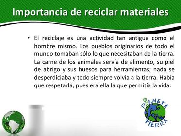 | ¿Por qué es importante el reciclaje? | Se pueden salvar grandes cantidades de recursos naturales no renovables cuando en los procesos de producción se utilizan materiales reciclados. Los recursos renovables, como los árboles, también pueden ser salvados. La utilización de productos reciclados disminuye el consumo de energía. Cuando se consuman menos combustibles fósiles, se generará menos CO2 y por lo tanto habrá menos lluvia ácida y se reducirá el efecto invernadero. |