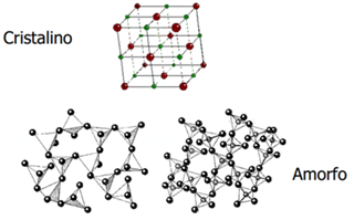 | De acuerdo a la estructura que presentan los sólidos pueden ser Amorfos y Cristalinos | Amorfos: Un sólido amorfo consiste en partículas acomodadas en forma irregular. Ejemplo: El vidrio Cristalino: Las partículas macroscópicas que los forman (los cristales) tienen formas regulares. Ejemplos: Sal de mesa (cloruro de sodio, NaCl) y el azúcar (sacarosa, C_{12}H_{22}O_{11})- |