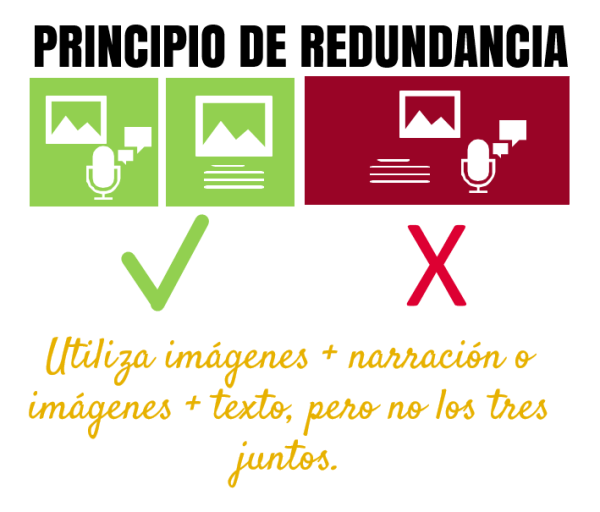 5.- Principio de Redundancia | ''Las personas aprenden mejor cuando las imágenes utilizadas son explicadas a través de una narración o de texto escrito, pero no con ambas a la vez'' |
