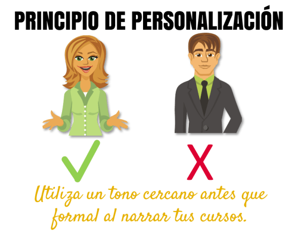 10.- Principio de Personalización | ''Las personas aprenden mejor cuando el tono utilizado en la narración de los cursos oline es cercano y familiar, que cuando el tono es formal'' |