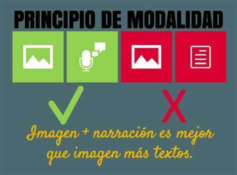 El conocimiento transmitido se entiende mejor cuando se explica a través de una narración, texto o imagen pero no con tres, pues el cerebro no puede atender todo a la vez por que se produce una sobrecarga cognitiva y esto afecta al aprendizaje. |