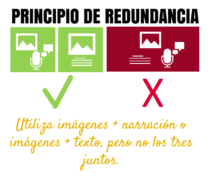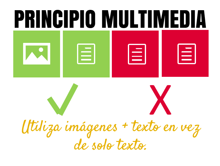 4.-Principio de modalidad: aprendemos mejor con imágenes y narración que son imágenes y texto en las dispositivas o vídeos. Principio multimedia: aprendemos mejor con imágenes y palabras que únicamente con palabras. | 5.-Principio de redundancia: aprendemos mejor con narración e imágenes que con narración, imágenes y texto. Principio de contigüidad espacial: aprendemos mejor cuando tanto la imagen como el texto están físicamente cerca. |