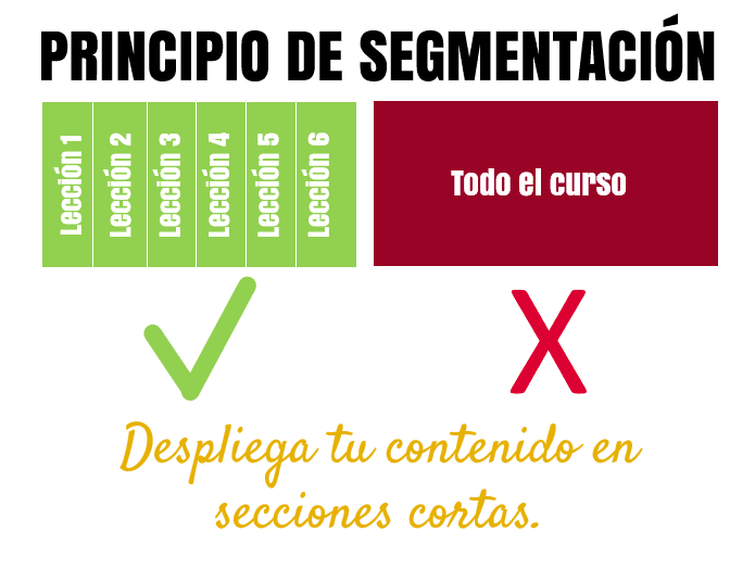 8.-Principio de segmentación: aprendemos mejor cuando la información se nos presenta segmentada o por apartados. | 9.-Principio de Pre-Entrenamiento. Las personas aprenden mejor cuando se les introducen los conceptos clave de la formación antes de ver los contenidos desarrollados. |