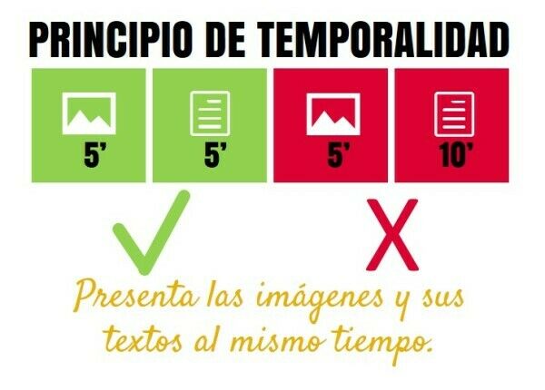 3. Principio de temporalidad Se aprende cuando las palabras y sus correspondientes imágenes se despliegan en la pantalla de forma simultánea. | |