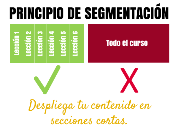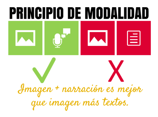 5. Principio de redundancia Aprendemos mejor cuando las imágenes utilizadas son explicadas o bien a través de una narración o a través de texto, pero no con ambas modalidades a la vez, ya que no aumenta el aprendizaje al combinarlas todas. | |