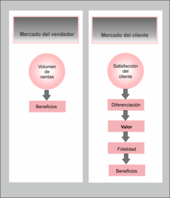 | dirección que sostiene que la clave para alcanzar los objetivos de la organización reside en identificar las necesidades y deseos del mercado objetivo y adaptarse para ofrecer las satisfacciones deseadas por el mercado de forma más eficiente que la competencia. | proceso que comprende la identificación de necesidades y deseos del mercado objetivo, la formulación de objetivos orientados al consumidor, la construcción de estrategias que creen un valor superior, la implantación de relaciones con el consumidor y la retención del valor del consumidor para alcanzar beneficios. |