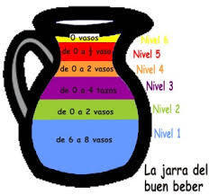 Niveles de la Jarra del Buen Beber | Nivel 1: Agua natural, tomar mucha, recomendado máximo 6 a 8 vasos diarios. Nivel 2: Leche semi-descremada, recomendado máximo 2 vasos. Nivel 3: Té y café sin azúcar, recomendado máximo 4 vasos. Nivel 4: Bebidas no calóricas recomendado máximo 2 vasos. Nivel 5: Jugo de fruta natural, leche entera, bebidas deportivas, recomendado máximo ½ vaso. Nivel 6: Refrescos, concentrados de jugos y otras, nunca deben de consumirse estas bebidas porque son muy dañinas para el cuerpo, no nutren, recomendado cero vasos. |