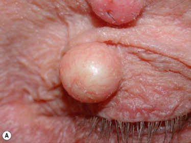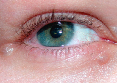| Quiste dermoide: Subcutáneo o más profundo Suele estar fijo al perostio Se debe a piel secuestrada durante el desarrollo embrionario | Hidrocistoma écrino: Menos común Cara medial y lateral del párpado No afecta el borde palpebral |