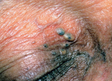 | Acné Milliar: Obstrucción de unidades pilosebáceas que retienen queratina. Pápulas diminutas Blancas Redondas Superficiales En grupos | Comedones: Tapones de queratina y sebo en el orificio dilatado de los folículos pilosos. Pacientes con acné vulgar. Obscuros Puntos negros |