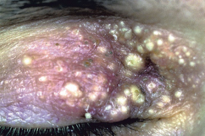 | Chalazión: lesión granulosa inflamatoria crónica estéril causada por retención sebácea en glándulas de meibomio | Clínica: Nódulo indoloro gradualmente creciente. Puede crecer tanto que presiona la córnea y causa astigmatismo y visión borrosa. -Si es de meiobomio estará en tarso. -Si es marginal estará en borde palpebral anterior. Tx: -Cirugía. -Inyección de corticoides: diacetato de triamcinolona. |