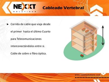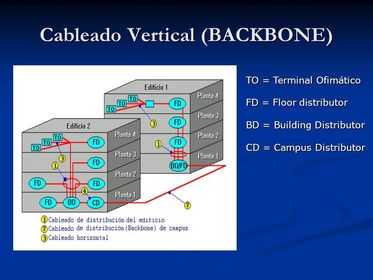 | Cableado Vertical | El cableado vertical (conocido como backbone) ofrece interconexión entre el cuarto de entrada de servicios, el cuarto del equipo, así como con los closet de comunicaciones. Debe ofrecer interconexión entre los equipos localizados en diferentes edificios, si es necesario. En el cableado vertical, la fibra óptica se ha convertido en el medio más apropiado, debido a la capacidad y velocidad que ofrece. |