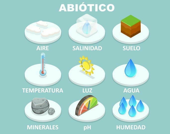 Componentes no vivos o abióticos | Tanto orgánicos como inorgánicos como el suelo, las rocas, la arena, a los que hay que añadir agentes atmosféricos como el viento y las precipitaciones. |