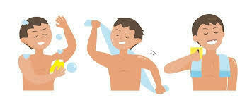 El lavado adecuado del cuerpo incluye ducharse regularmente con jabón, lavar el cabello varias veces a la semana, y mantener las uñas y los dientes limpios. | |