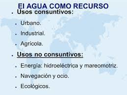 | USO CONSUNTIVO Implica el consumo del agua de modo que una vez utilizada, siempre una parte de ella no podrá ser utilizada de nuevo. USO NO CONSUNTIVO No merma cantidad ni calidad de agua, permitiendo su utilización en otros usos. | |