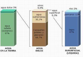 | AGUA DULCE El agua dulce potable supone solamente el 0.008% del agua terrestre, lo que hace que en ocasiones su uso plantee complejos problemas. Todos se podrían resumir en una frase: "existe un desajuste entre la demanda, en cantidad y en calidad, y las disponibilidades en un momento dado y en un lugar concreto". | |