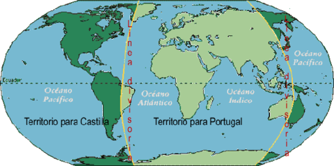 | TRATADO DE TORDESILLAS | El 7 de junio de 1494 en Tordesillas Castilla y Portugal firman un tratado que dividía el océano Atlántico por medio de una raya trazada de polo a polo. El hemisferio oriental fue para la Corona de Portugal y el occidental para Castilla. En este tratado se pone fin a la guerra de sucesión , provocada por la muerte de Enrique IV, y se repartían los derechos de navegación y conquista del océano Atlántico. |