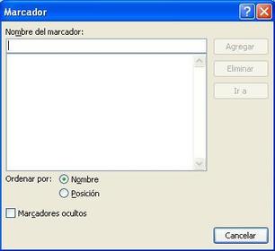 | Esta ventana aparece cuando oprimes el icono de Marcador, sirve para marcar palabras que quieres que se vinculen. | |