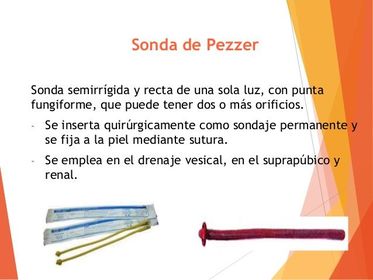 sonda pezzer | sonda semirigida recta de una sola luz, con punta fungiforme que puede tener dos o mas orifiicos se inserta quirurgicamente y requiere, sutura para fijarla, |