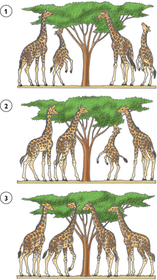 | "REPRODUCCIÓN DIFERENCIAL" La reproducción diferencial es una de las condiciones que deben ocurrir para que haya evolución de los seres vivos, porque es el mecanismo por el cual unos individuos tienen más descendencia que otros. Si un individuo es fuerte y sano, será elegido con mas frecuencia por sus parejas para reproducirse, si este individuo tiene una característica que lo hace diferente a los demás (por ejemplo su fuerza o sus colores más vivos) este característica se pasará a su descendencia sin duda, quedando fuera las características de individuos que no han podido reproducirse, así que los descendientes tendrán ese rasgo y la reproducción habrá diferenciado esas cualidades, así que esa especie evolucionará con esos rasgos. | Elegí esta imagen ya que nos muestra claramente como las jirafas van evolucionando debido a las selecciones y preferencias de reproducción diferencial que tuvieron sus antepasados. |