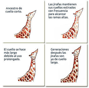 | "TEORIA DE LAMARCK" Lamarckismo es el término usado para referirse a la teoría de la evolución formulada por Lamarck. En 1809 en su libro Filosofía zoológica propuso que las formas de vida no habían sido creadas ni permanecían inmutables, como se aceptaba en su tiempo, sino que habían evolucionado desde formas de vida más simples. Describió las condiciones que habrían propiciado la evolución de la vida y propuso el mecanismo por el que habría evolucionado. Lamarck en su teoría propuso que la vida evolucionaba “por tanteos y sucesivamente”, “que a medida que los individuos de una de nuestras especies cambian de situación, de clima, de manera de ser o de hábito, reciben por ello las influencias que cambian poco a poco la consistencia y las proporciones de sus partes, de su forma, sus facultades y hasta su misma organización”.4 Sería la capacidad de los organismos de adaptarnos al medio ambiente. | La teoría se refiere a que los seres vivos fuimos cambiando nuestro cuerpo y características porque nos teníamos que adaptar al medio ambiente y a los cambios que presenta. |