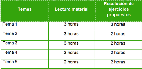 | Distribución de tiempo que consideramos tiene el estudio de cada uno de temas. | |