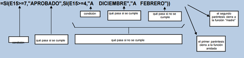 | Cuando utilizamos una función dentro de otra, tenemos una función anidada. Las funciones que “metemos dentro” de otra función actúan como argumentos de la función principal | La segunda función SI es parte del argumento de la función SI principal. Cuando frente a una condición tenemos dos o más posibilidades, tenemos que anidar una función SI dentro de otra función SI. |