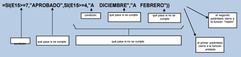 | Pero si el alumno obtiene una calificación menor a 7, se presentan dos situaciones: - Si obtiene una calificación mayor o igual a 4 puntos, debe rendir examen en el turno de diciembre. | -Si obtiene una calificación menor a 4 puntos, debe rendir examen en el turno de febrero. Cada una de las funciones SI conservan su estructura, con tres elementos en el argumento. |