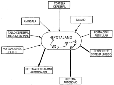 | NÚCLEOS HIPOTALÁMICOS | HIPOTÁLAMO Tareas: -Endocrino -Control autonomico -Limbico y emocional Tiene control de: -Temperatura -Reproducción -Ingesta -Metabolismo -Balance hídrico -Comportamiento |