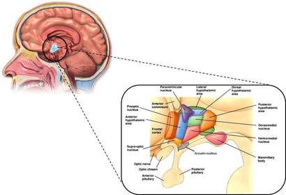 | NÚCLEO ARCUADO (Región infundibular) | Funciones: -Contiene Somatostatina, Neuropeptido Y, Neurotensina, ACTH -Sus neuronas dopamirnérgicas inhiben la liberación de Prolactina |