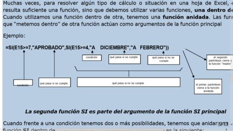 | FUNCIONES ANIDADAS | Muchas veces para resolver algún tipo de calculo o situación en un hoja de Excel, no nos resulta suficiente una función. |