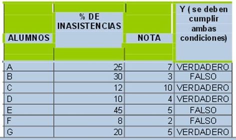 | FUNCIONES LÓGICAS: Y/O FUNCIÓN Y Devuelve VERDADERO si se verifican todas las condiciones planteadas en su u argumento. Si se verifica una sola de las condiciones o ninguna, devuelve falso. EJEMPLO: Para aprobar un curso se debe considerar: a) que el % de inasistencias sea menor o igual a 25 b) que la nota onbtenida sea mayor o igual a 4 | La sintaxis de esta función es: =Y(B2<=25;C2>=4) La tabla resuelta sería la que esta a continuación: |