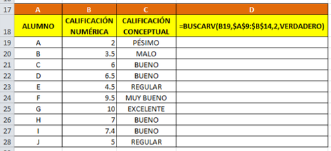 Un docente tiene la calificación de sus alumnos en notas numéricas, pero debe clasificarlas según los siguientes criterios: | Debe completar la siguiente hoja de seguimiento. Para completar la columna "Calificación Conceptual" va a utilizar la función BUSCARV que le permitirá relacionar datos. |