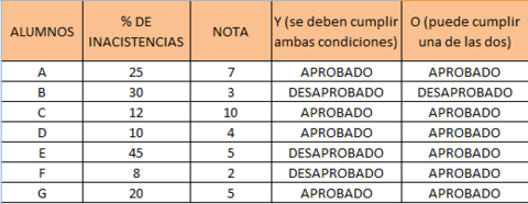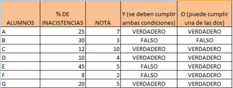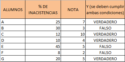 | FUNCIÓN: Y Devuelve VERDADERO si se verifican todas las condiciones planteadas en su argumento, si no se devuelve FALSO. -Sintaxis: =Y(B2<=25,C2>=4) | |