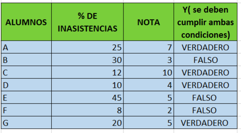 | Si se verifica una sola de las condiciones o ninguna, devuelve falso. | Un ejemplo: para aprobar un curso los alumnos deben considerar dos variables: A) que el % de inasistencias sea menor o igual a 25 Y b) que la nota obtenida sea mayor o igual a 4. |