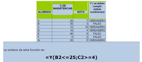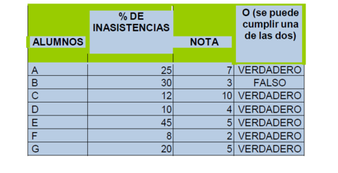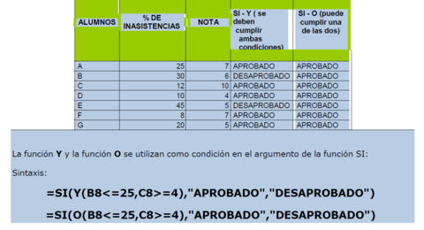 | Las funciones lógicas Y-O se utilizan anidadas dentro de la función SI, para obtener un resultado con sentido. |