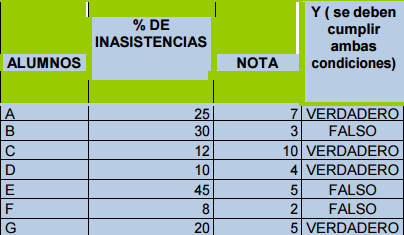 | Funcion Y | La función Y devuelve VERDADERO si se verifican todas las condiciones planteadas en su argumento. Si se verifica una sola de las condiciones o ninguna, devuelve FALSO. |
