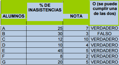 | Funcion O | La función O devuelve VERDADERO si se verifica una sola de las condiciones planteadas en su argumento. Si no se verifica ninguna condición, devuelve FALSO. |